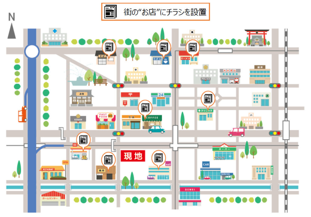 お客様の希望エリア内でターゲットの生活動線上の店舗にチラシを設置して、地域住民や潜在客層に直接アプローチし、効果的な認知を獲得します。