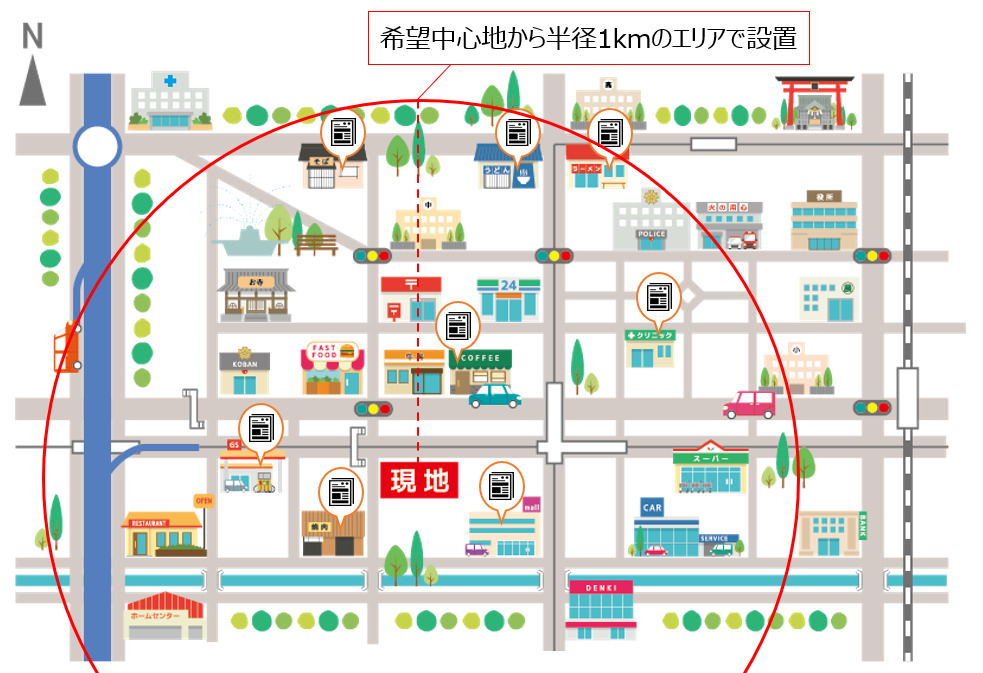 A.ターゲット層や業種に合わせて、飲食店・美容サロン・スクール・病院など地域密着型の店舗を選定・設置いたします。エリアや希望属性に応じたカスタマイズも可能です。